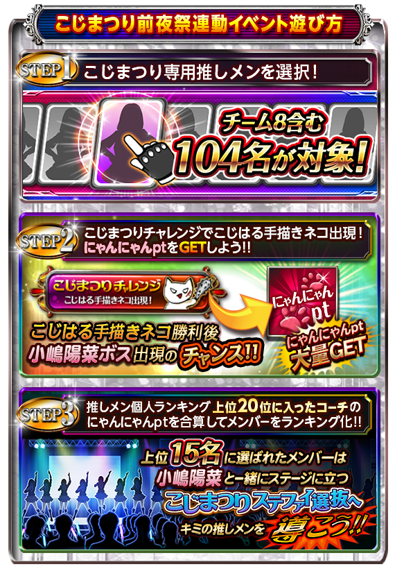 内容:「こじまつり~前夜祭~」にて、小嶋陽菜と一緒に歌う15名のメンバー「こじまつりステファイ選抜」をゲーム内で選抜するイベントとなります。