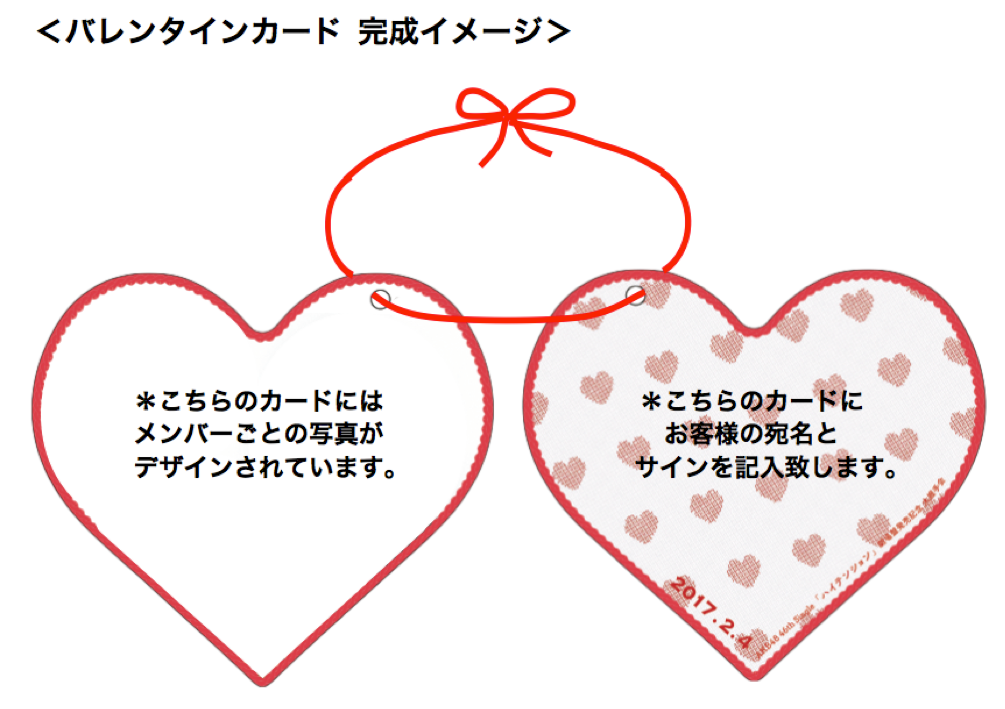 この2枚のカードを、メンバーとお客様のつながった「運命の赤い糸」で結んでいただくと、メンバーと赤い糸でつながった証となる「バレンタインカード」が完成致します!メンバーとの赤い糸がつながったお客様は、2枚のバレンタインカードと、赤い糸を忘れずにお受け取り下さい!