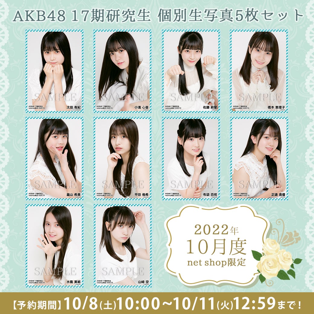 AKB48 17期研究生 2022年10月度 net shop限定個別生写真5枚セット | AKB48 Official ShopAKB48 Official Shopが販売するAKB48 17期研究生 2022年10月度 net shop限定個別生写真5枚セットの販売ページです。AKB48 Official ShopはAKB48の公式通販サイトです。メンバー個別グッズやライブグッズ、生誕グッズ、生写真をはじめ、CDやDVD&Blu-rayも取扱い中!shop.akb48.co.jp