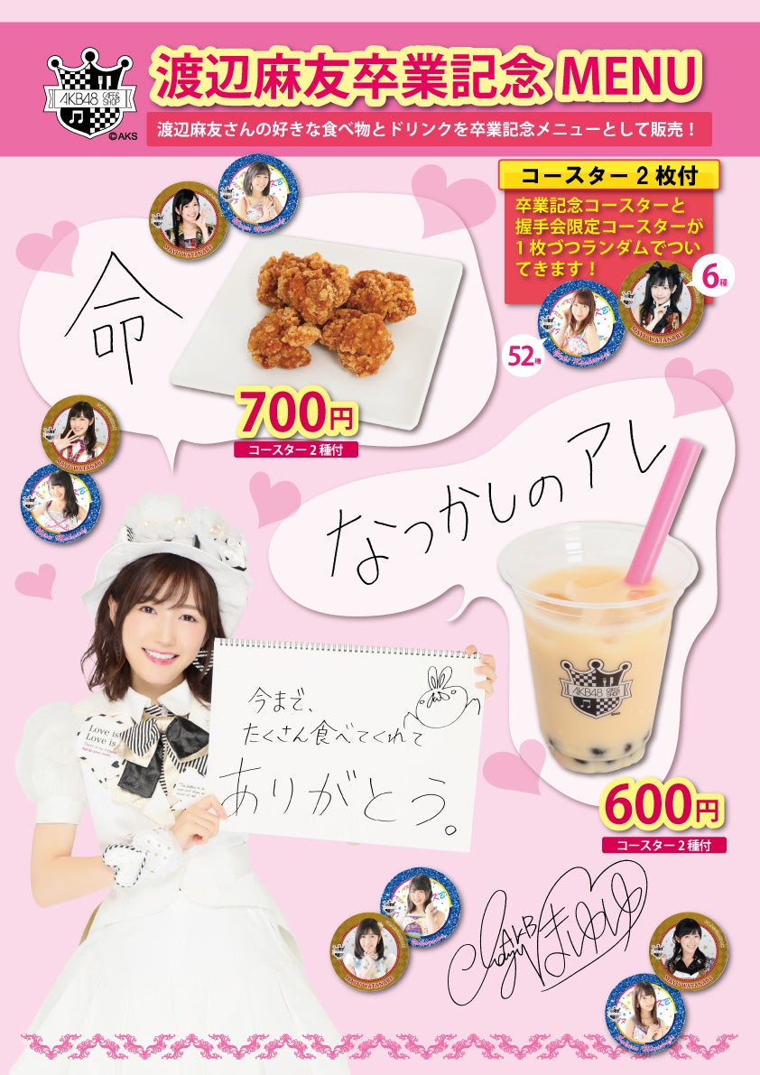 ご注文のお客様には1種につき渡辺麻友卒業記念限定コースターと握手会限定コースターをそれぞれランダムで1枚づつプレゼント。