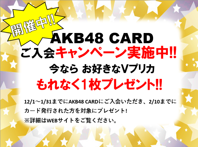 12月1日~1月31日の期間に新たにご入会いただき、2月10日までにAKB48 CARDを発行された会員さまが対象となります。