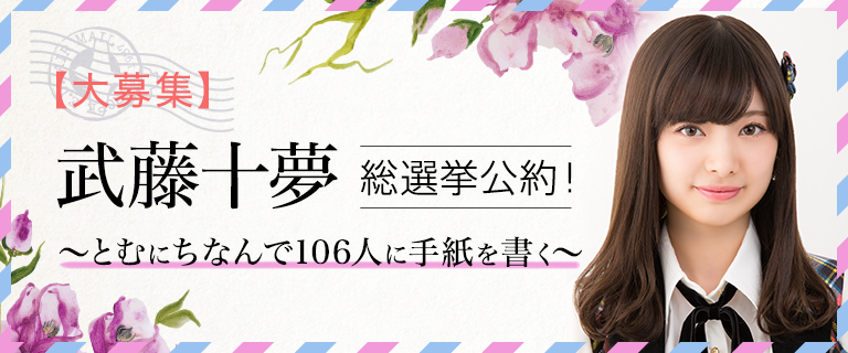 今年6月に行われた「AKB48 53rdシングル世界選抜総選挙」において見事7位にランクインした武藤十夢(AKB48 TeamK)が選挙公約として掲げていた「とむにちなんで106人に手紙を書く」