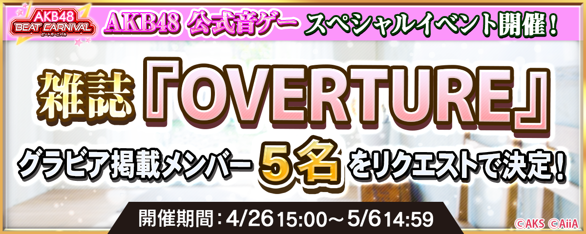 AKB48公式音ゲースマホアプリ「AKB48ビートカーニバル(Aビート)」にて、雑誌『OVERTURE』とのタイアップ企画を実施します!