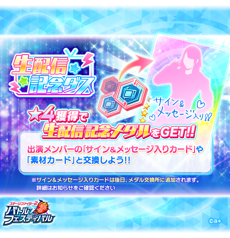さらに同日19:30より生配信記念ダスを開催いたします。ダスを引くともらえる生配信記念メダルを集めてメンバーの「サイン&メッセージ入りカード」を手に入れよう!