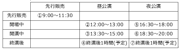 ※②⑤の開場中販売は、会場内での販売につき、該当公演のチケットをお持ちの方のみ商品をご購入いただけます。