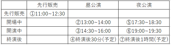 ※昼公演・夜公演それぞれの開場から開演までの時間内にブースにて商品をご購入いただくと、1会計につき1枚「抽選券」をお渡しさせていただきます。お時間を過ぎますと配布は出来ません。予めご了承ください。