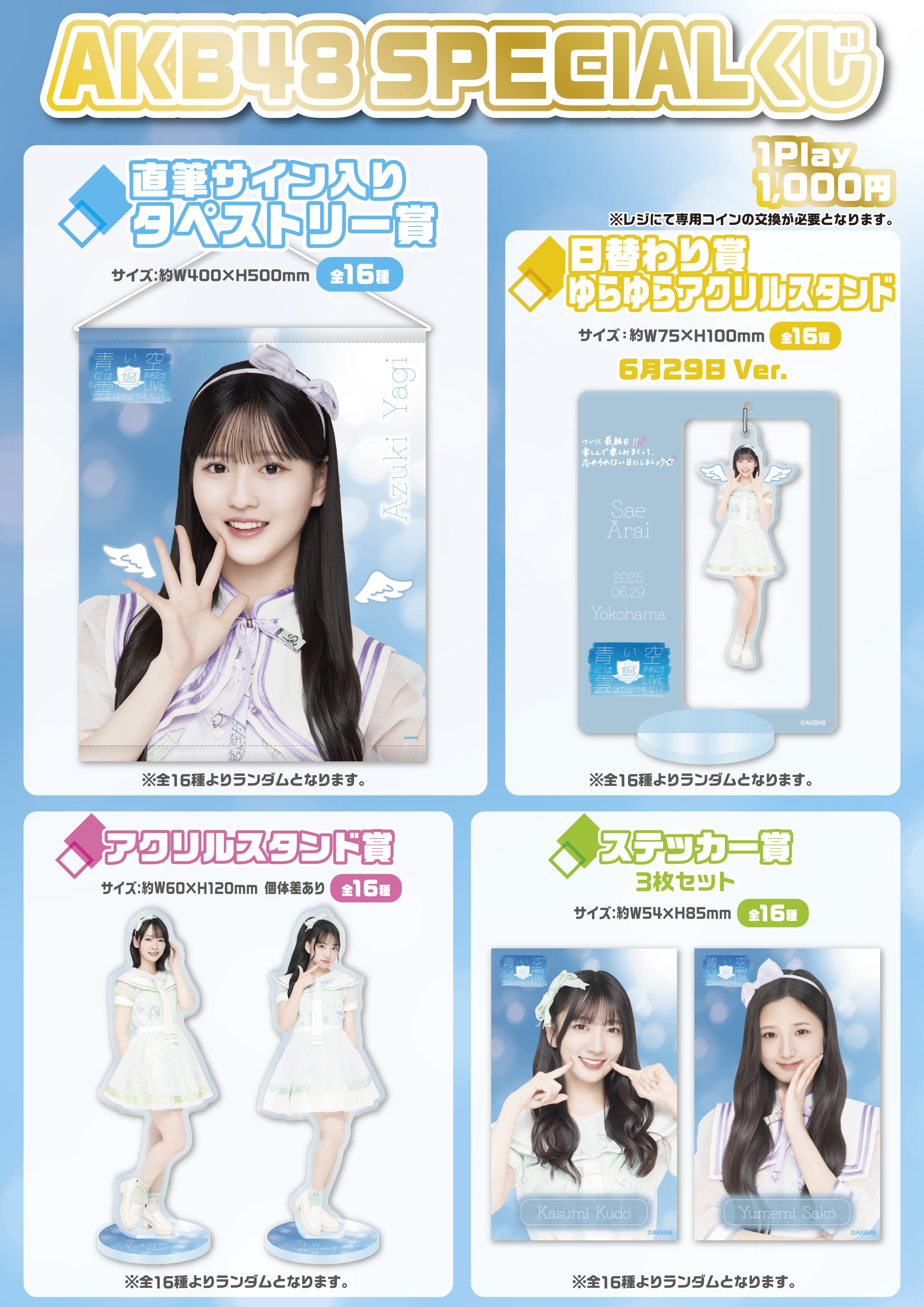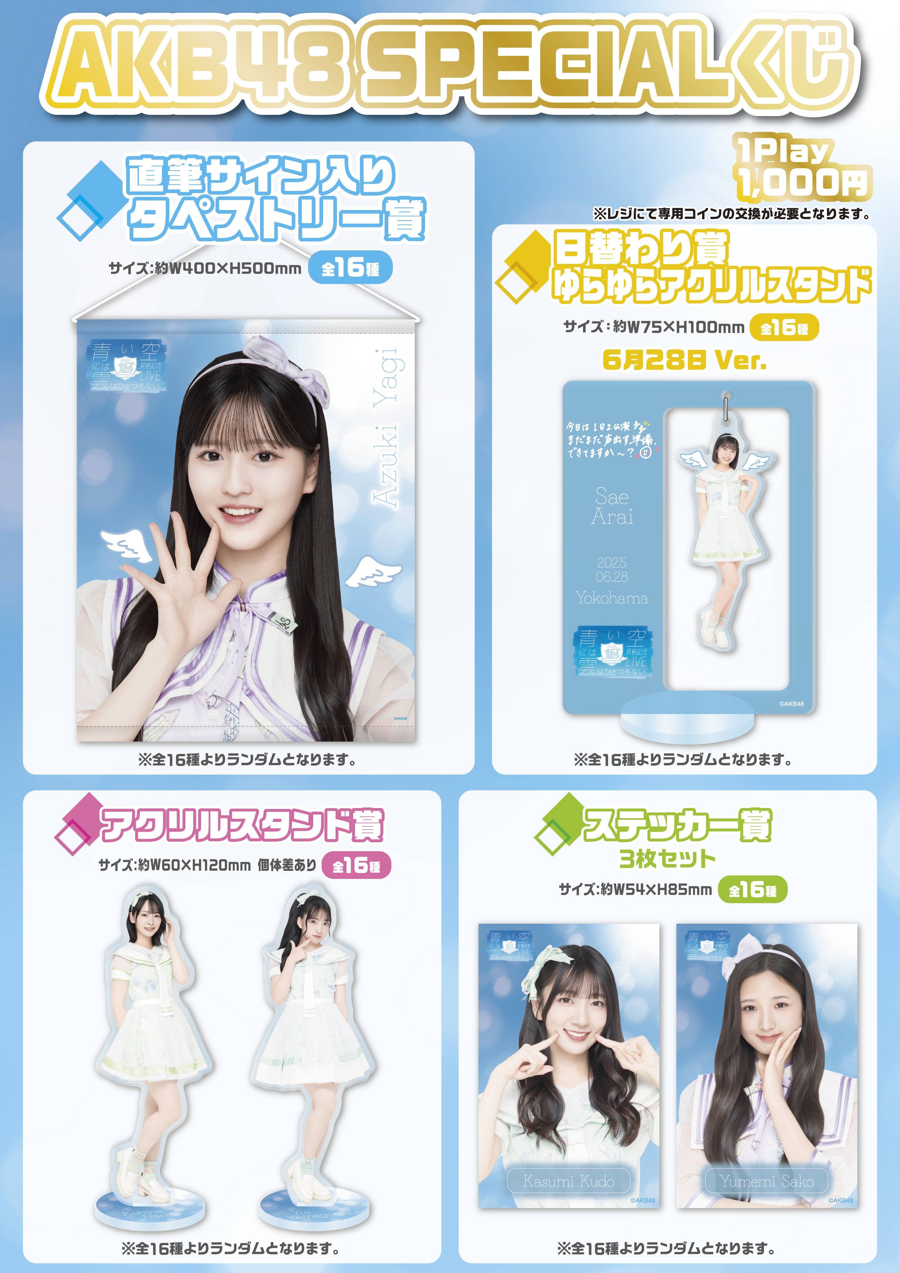 6/27(金)~6/29(日)の3日間KT Zepp Yokohamaにて開催されます「AKB48 18期生昇格記念LIVE!〜青い空には 雲はひとつもない〜」にて豪華賞品が当たるAKB48 SPECIALくじを開催させていただきます!