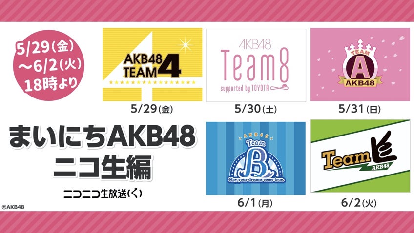 「ニコニコ生放送」にて、AKB48の各チームが出演する番組「まいにちAKB48ニコ生編」を5月29日(金)から6月2日(火)の5日間にわたり、毎日18時からを生放送することが決定致しました。