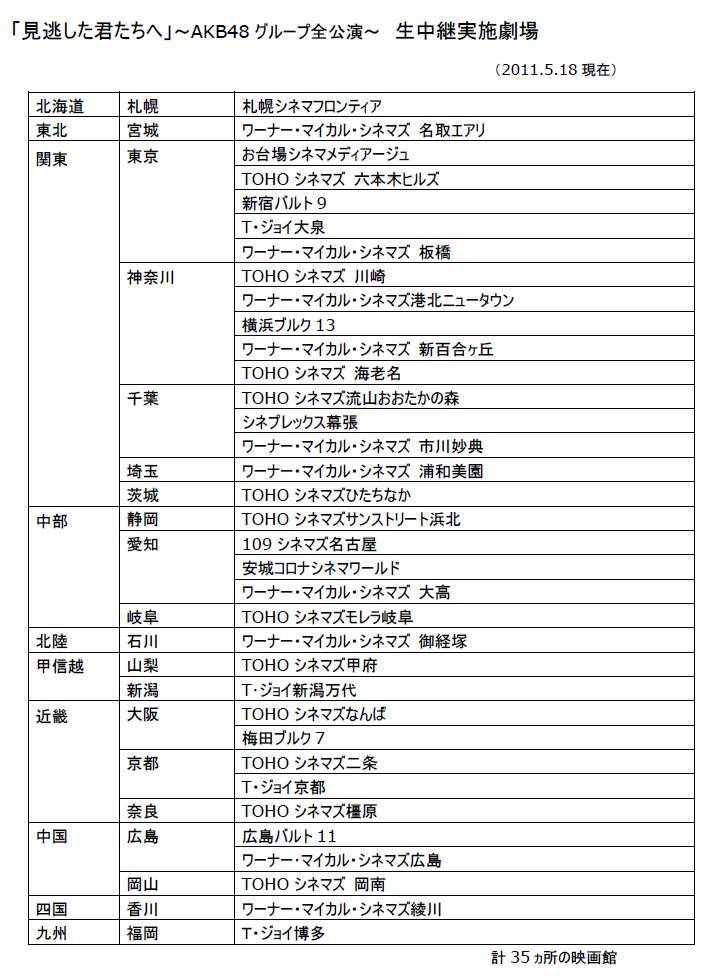 TOKYO DOME CITY HALL(旧JCBホール)にて連続公演されるイベント“「見逃した君たちへ」~AKB48グループ全公演~”の映画館生中継の映画館が決定いたしました。