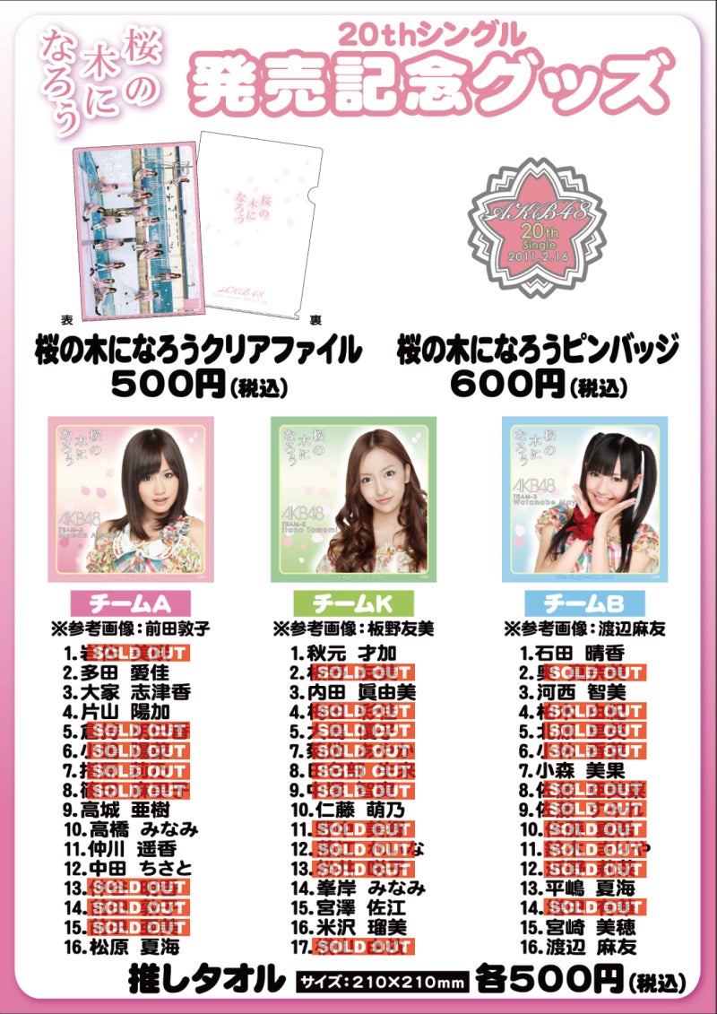 <2011.2.16(水)発売 20thシングル「 桜の木になろう<劇場盤> 」大握手会での取扱いグッズのお知らせです。