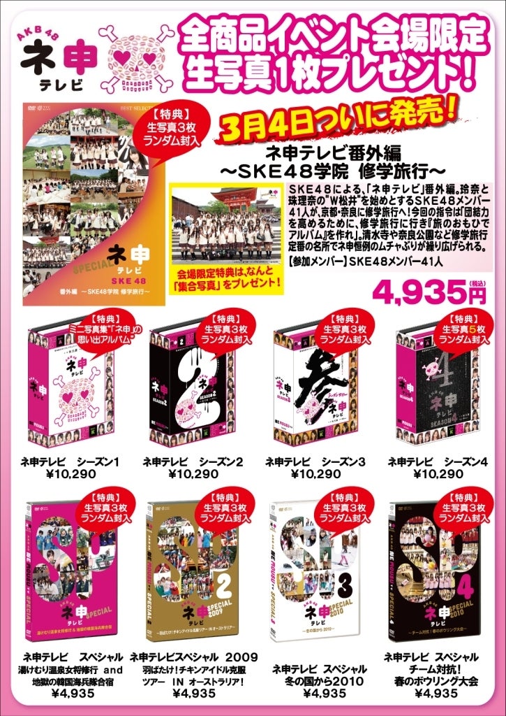 なんと、ネ申TVDVDにおいて全ての商品、握手会限定生写真を1枚プレゼント!