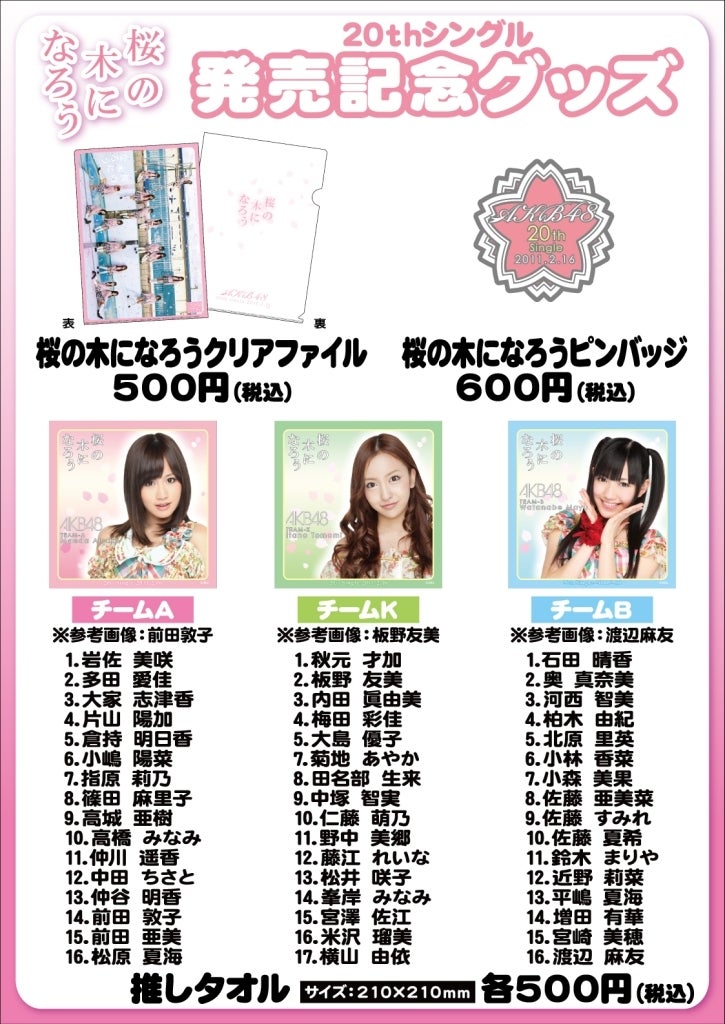 3月5日(土)6日(日)の2日間 20thマキシシングル『桜の木になろう【通常盤】』全国握手会イベント AKB48祭り powered by ネ申テレビ(関東:さいたまスーパーアリーナ)取扱グッズについてのお知らせ。