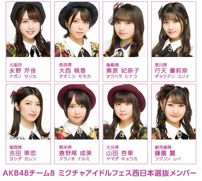 AKB48チーム8 ミクチャアイドルフェス西日本選抜は、永野芹佳、大西桃香、奥原妃奈子、行天優莉奈、吉田華恋、倉野尾成美、山田杏華、藤園麗の8名!