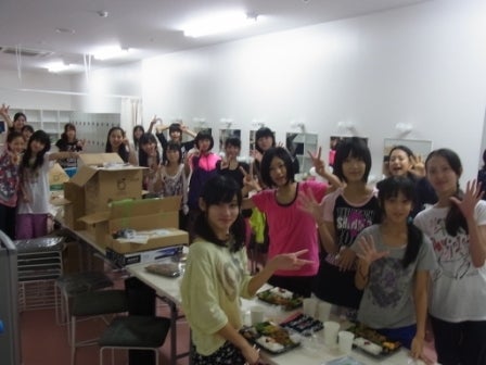 メンバーが合宿所のような広い楽屋でランチ中!