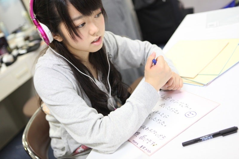 優子がいたずらな顔で何やら書いています。