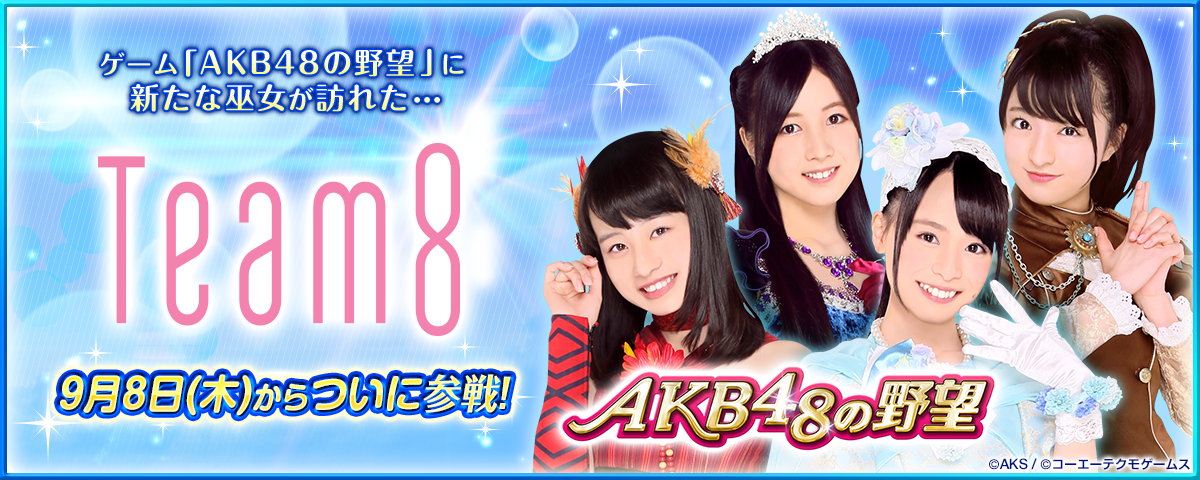 ソーシャルシミュレーションゲーム『AKB48の野望』において、2016年9月8日(木)にAKB48「Team 8」メンバー全47名がついに登場いたしました。