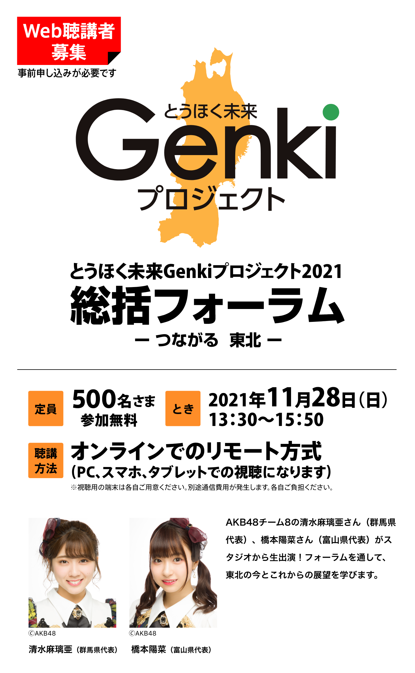 11月28日(日)にオンラインにて開催される「とうほく未来Genkiプロジェクト」総括フォーラムにAKB48チーム8より2名が登場!