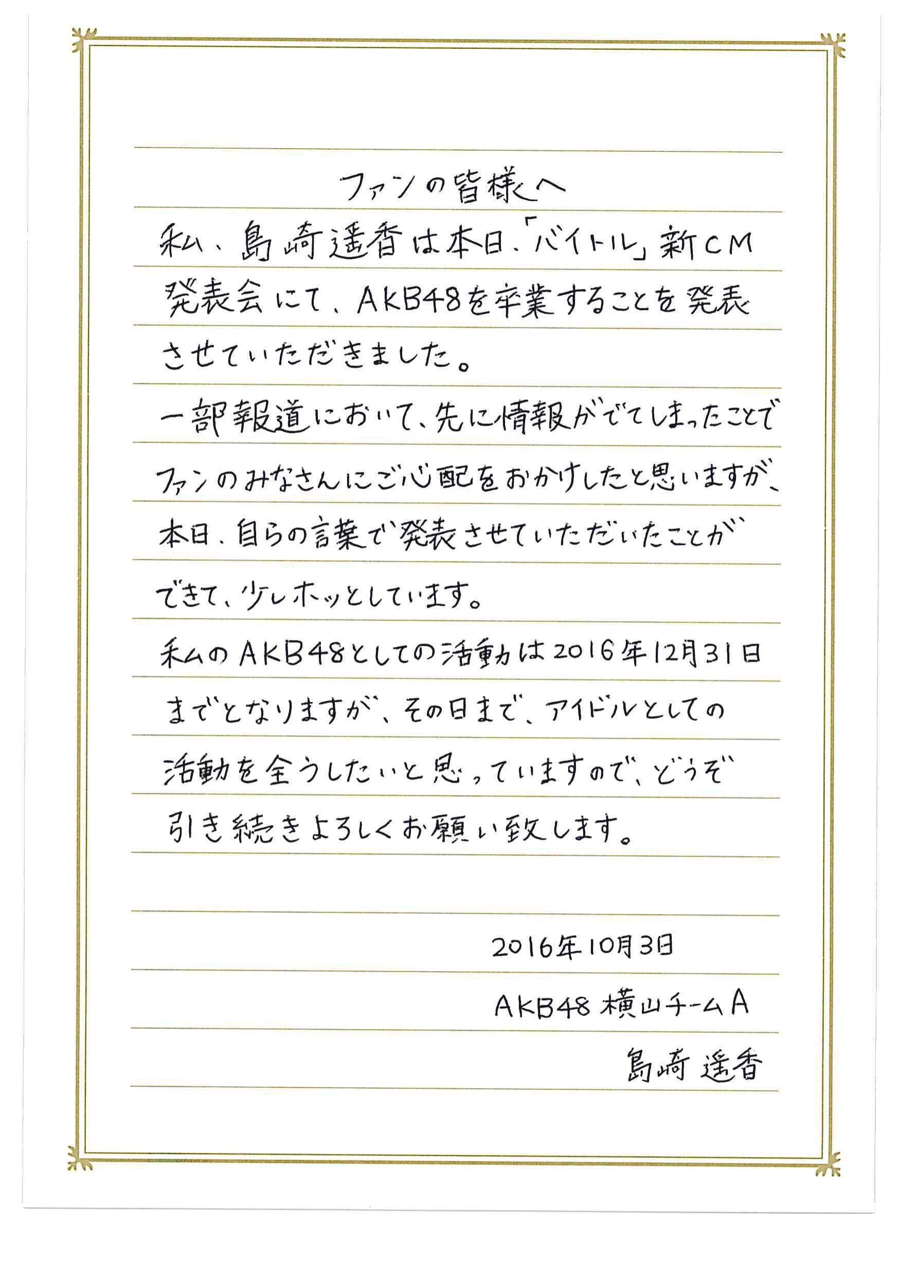 本日のバイトル新CM記者発表にて島崎遥香がAKB48を卒業することを発表致しました。以下に本人から皆様へのコメントを掲載させて頂きます。