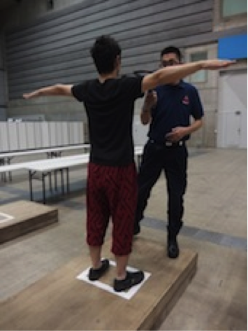 金属探知機による検査の際は、両腕を肩の位置まであげてください。