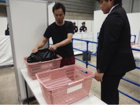③ 手荷物は、すべてブース手前の荷物置場(カゴの中)へ置いてください。