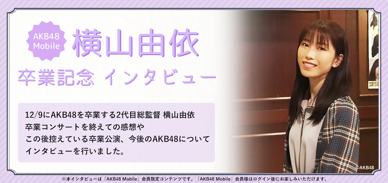 本日12月7日(火)よりAKB48 Mobile「会員限定コンテンツ」内の「インタビュー」コーナーにて、12月9日(木)にAKB48を卒業する2代目総監督 横山由依のインタビューをお届けいたします!