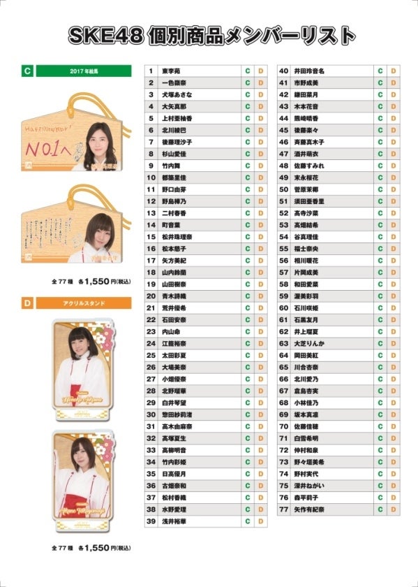 ・SKE48個別卓上カレンダー 2017 全47種 販売価格 各2,000円(税込)