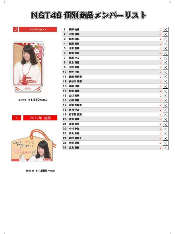 ・NGT48個別B2カレンダー 2017 全8種 販売価格 各3,000円(税込)